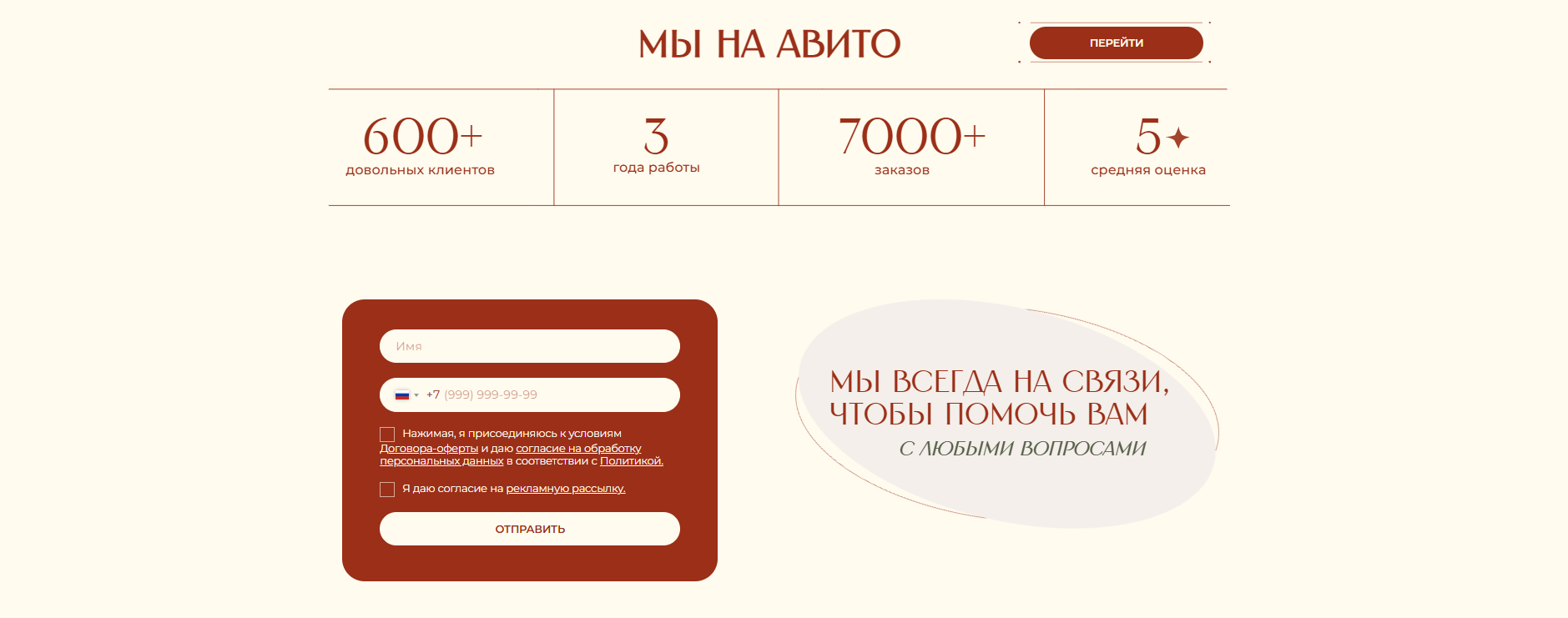 В конце были созданы блок Вопрос-Ответ, реальные отзывы с Авито (можно перейти, кликнул на понравившийся отзыв), а также еще немного преимуществ и кнопка перехода в профиль Авито, т.к. основная деятельность ведется именно там. Зафиналили эту страницу простой формой обратной связи: