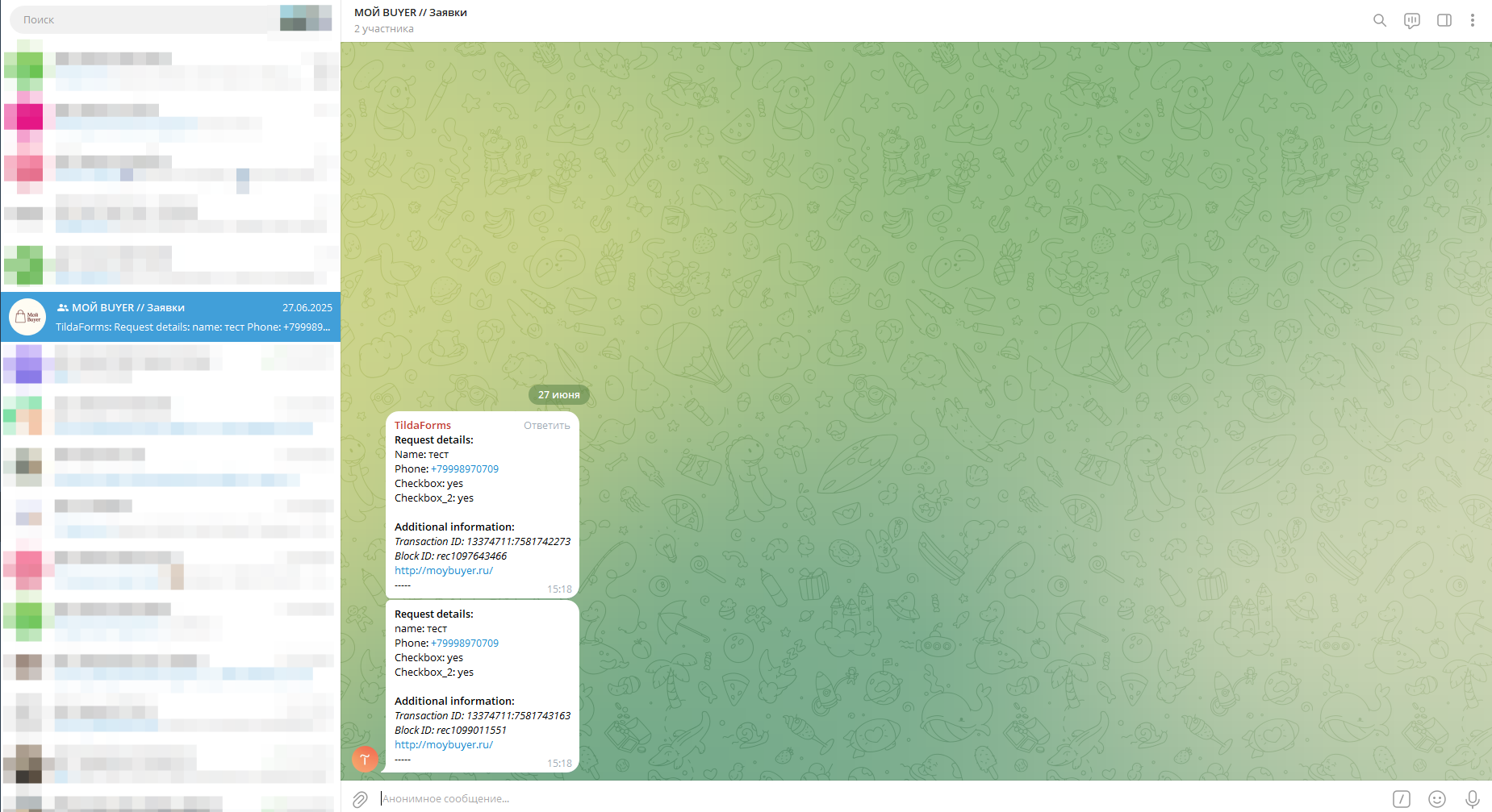 Все заявки с сайта поступают в созданную частную группу в Телеграмм, а также на Email и во внутреннюю CRM от Tilda. Пример заявки в ТГ ниже: